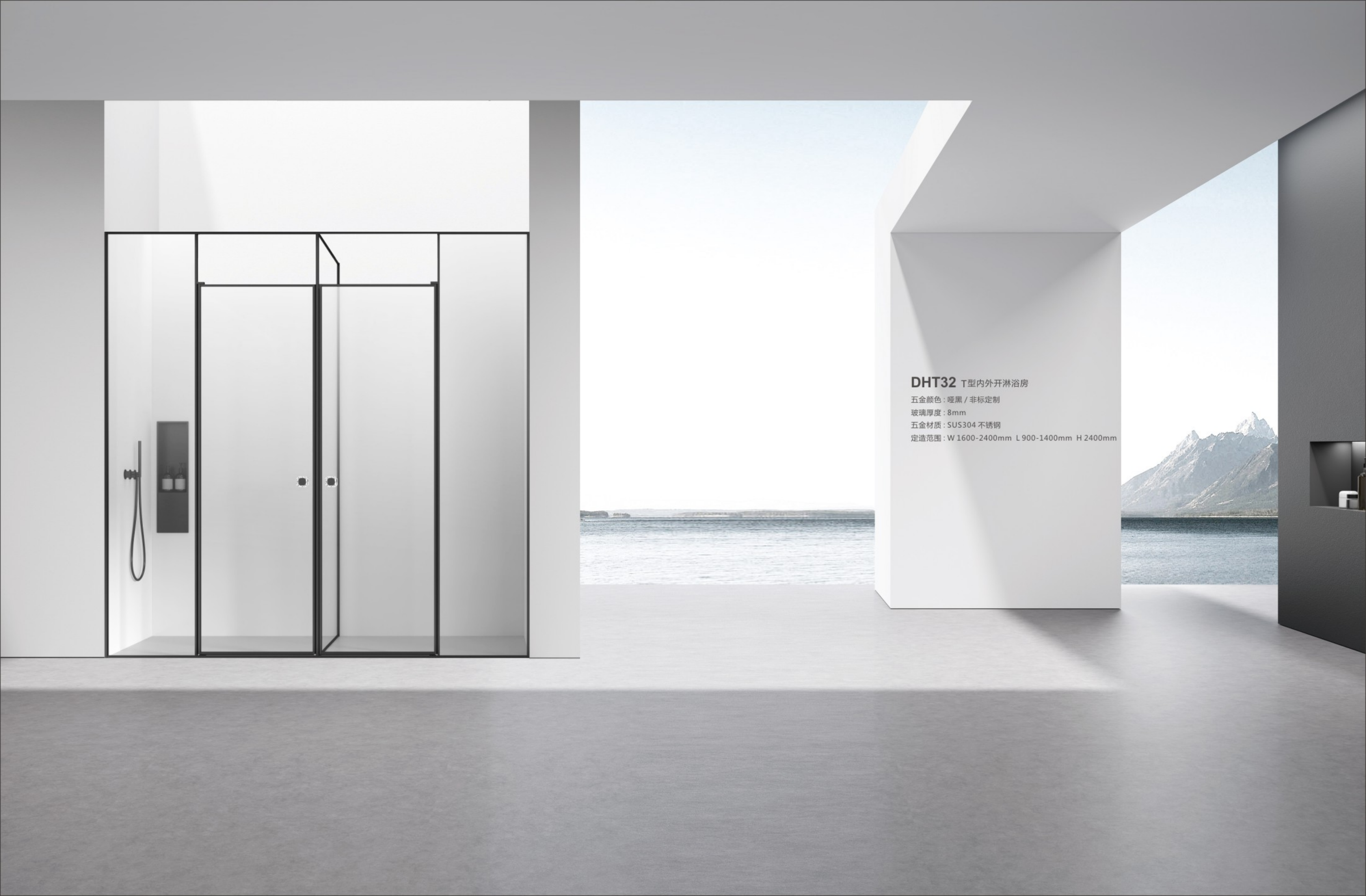 五金颜色:哑黑/非标定制 玻璃厚度:8mm 五金材质:SUS304不锈钢 定造范围:W1600-2400mm L900-1400mm H2400mm